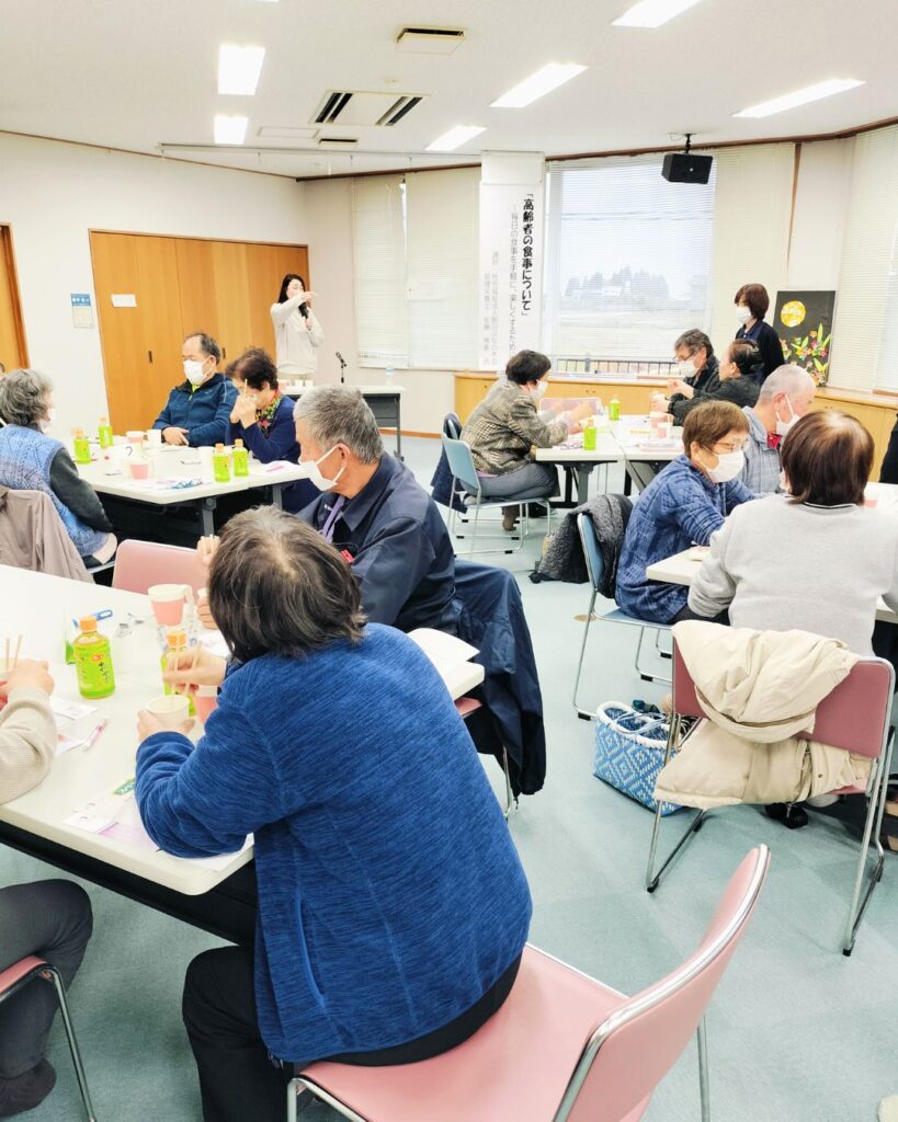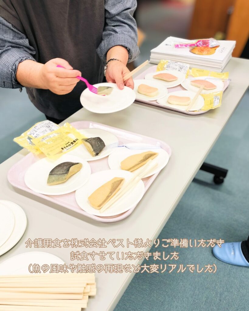 この日には株式会社ベスト様に特別にお越しいただき、介護食の試食の提供をうけ、その風味や食感を味わいました。見た目も本物そっくりに作られており、想像と味のマッチングは食にとって重要なことだと改めて実感しました。